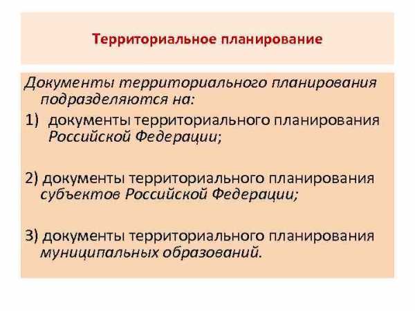 Территориальное планирование Документы территориального планирования подразделяются на: 1) документы территориального планирования Российской Федерации; 2) документы территориального планирования субъектов Российской Федерации; 3) документы территориального планирования муниципальных образований.