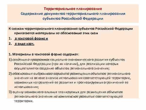 Территориальное планирование Содержание документов территориального планирования субъектов Российской Федерации К схемам территориального планирования субъектов Российской Федерации прилагаются материалы по обоснованию этих схем 1. в текстовой форме и 2. в виде карт. 1. Материалы в текстовой форме содержат: 1) сведения о программах социально-экономического развития субъектов Российской Федерации (при их наличии), для реализации которых осуществляется создание объектов регионального значения; 2) обоснование выбранного варианта размещения объектов регионального значения на основе анализа использования соответствующей территории, возможных направлений ее развития и прогнозируемых ограничений ее использования; 3) оценку возможного влияния планируемых для размещения объектов регионального значения на комплексное развитие соответствующей территории.