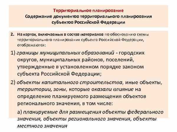Территориальное планирование Содержание документов территориального планирования субъектов Российской Федерации 2. На картах, включаемых в состав материалов по обоснованию схемы территориального планирования субъекта Российской Федерации, отображаются: 1) границы муниципальных образований – городских округов, муниципальных районов, поселений, утвержденные в установленном порядке законом субъекта Российской Федерации; 2) объекты капитального строительства, иные объекты, территории, зоны, которые оказали влияние на определение планируемого размещения объектов регионального значения, в том числе: а) планируемые для размещения объекты федерального значения, объекты регионального значения, объекты местного значения