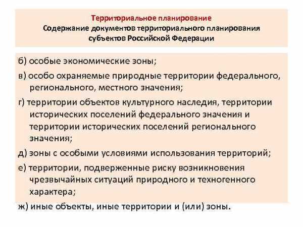 Территориальное планирование Содержание документов территориального планирования субъектов Российской Федерации б) особые экономические зоны; в) особо охраняемые природные территории федерального, регионального, местного значения; г) территории объектов культурного наследия, территории исторических поселений федерального значения и территории исторических поселений регионального значения; д) зоны с особыми условиями использования территорий; е) территории, подверженные риску возникновения чрезвычайных ситуаций природного и техногенного характера; ж) иные объекты, иные территории и (или) зоны.