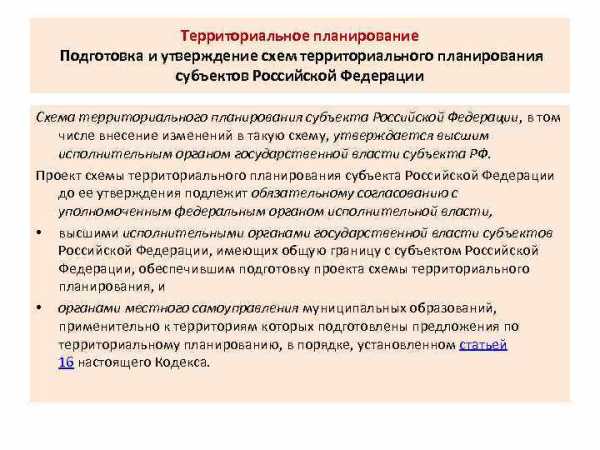 Территориальное планирование Подготовка и утверждение схем территориального планирования субъектов Российской Федерации Схема территориального планирования субъекта Российской Федерации, в том числе внесение изменений в такую схему, утверждается высшим исполнительным органом государственной власти субъекта РФ. Проект схемы территориального планирования субъекта Российской Федерации до ее утверждения подлежит обязательному согласованию с уполномоченным федеральным органом исполнительной власти, • высшими исполнительными органами государственной власти субъектов Российской Федерации, имеющих общую границу с субъектом Российской Федерации, обеспечившим подготовку проекта схемы территориального планирования, и • органами местного самоуправления муниципальных образований, применительно к территориям которых подготовлены предложения по территориальному планированию, в порядке, установленном статьей 16 настоящего Кодекса.