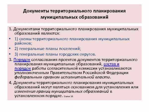 Документы территориального планирования муниципальных образований 1. Документами территориального планирования муниципальных образований являются: • 1) схемы территориального планирования муниципальных районов; • 2) генеральные планы поселений; • 3) генеральные планы городских округов. 3. Порядок согласования проектов документов территориального планирования муниципальных образований, состав и порядок работы согласительной комиссии устанавливаются уполномоченным Правительством Российской Федерации федеральным органом исполнительной власти. 4. Документы территориального планирования муниципальных образований могут являться основанием для установления или изменения границ муниципальных образований в установленном порядке. Статья 18.