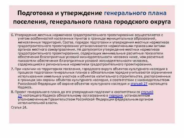 Подготовка и утверждение генерального плана поселения, генерального плана городского округа 6. Утверждение местных нормативов градостроительного проектирования осуществляется с учетом особенностей населенных пунктов в границах муниципальных образований, межселенных территорий. Состав, порядок подготовки и утверждения местных нормативов градостроительного проектирования устанавливаются нормативными правовыми актами органов местного самоуправления. Не допускается утверждение местных нормативов градостроительного проектирования, содержащих минимальные расчетные показатели обеспечения благоприятных условий жизнедеятельности человека ниже, чем расчетные показатели обеспечения благоприятных условий жизнедеятельности человека, содержащиеся в региональных нормативах градостроительного проектирования. 7. При наличии на территориях поселения, городского округа объектов культурного наследия в процессе подготовки генеральных планов в обязательном порядке учитываются ограничения использования земельных участков и объектов капитального строительства, расположенных в границах зон охраны объектов культурного наследия, в соответствии с законодательством Российской Федерации об охране объектов культурного наследия и статьей 27 настоящего Кодекса. 8. Проект генерального плана до его утверждения подлежит в соответствии со статьей 25 настоящего Кодекса обязательному согласованию в порядке, установленном уполномоченным Правительством Российской Федерации федеральным органом исполнительной власти. Статья 24.