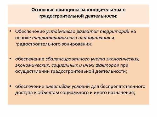 Основные принципы законодательства о градостроительной деятельности: • Обеспечение устойчивого развития территорий на основе территориального планирования и градостроительного зонирования; • обеспечение сбалансированного учета экологических, экономических, социальных и иных факторов при осуществлении градостроительной деятельности; • обеспечение инвалидам условий для беспрепятственного доступа к объектам социального и иного назначения;