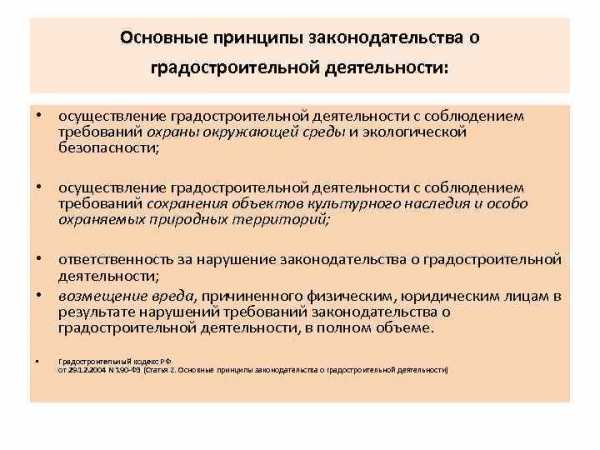 Основные принципы законодательства о градостроительной деятельности: • осуществление градостроительной деятельности с соблюдением требований охраны окружающей среды и экологической безопасности; • осуществление градостроительной деятельности с соблюдением требований сохранения объектов культурного наследия и особо охраняемых природных территорий; • ответственность за нарушение законодательства о градостроительной деятельности; • возмещение вреда, причиненного физическим, юридическим лицам в результате нарушений требований законодательства о градостроительной деятельности, в полном объеме. • Градостроительный кодекс РФ от 29. 12. 2004 N 190 -ФЗ (Статья 2. Основные принципы законодательства о градостроительной деятельности)