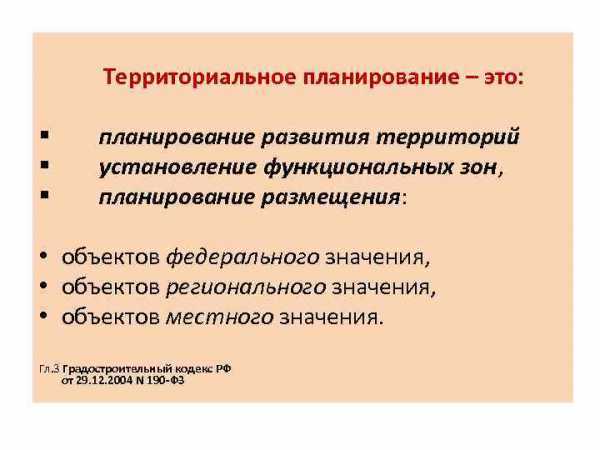 § § § Территориальное планирование – это: планирование развития территорий установление функциональных зон, планирование размещения: • объектов федерального значения, • объектов регионального значения, • объектов местного значения. Гл. 3 Градостроительный кодекс РФ от 29. 12. 2004 N 190 -ФЗ