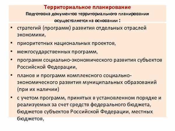 Территориальное планирование Подготовка документов территориального планирования осуществляется на основании : • стратегий (программ) развития отдельных отраслей экономики, • приоритетных национальных проектов, • межгосударственных программ, • программ социально-экономического развития субъектов Российской Федерации, • планов и программ комплексного социальноэкономического развития муниципальных образований (при их наличии) • с учетом программ, принятых в установленном порядке и реализуемых за счет средств федерального бюджета, бюджетов субъектов Российской Федерации, местных бюджетов,