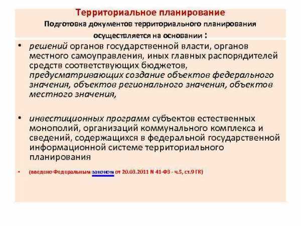 Территориальное планирование Подготовка документов территориального планирования осуществляется на основании : • решений органов государственной власти, органов местного самоуправления, иных главных распорядителей средств соответствующих бюджетов, предусматривающих создание объектов федерального значения, объектов регионального значения, объектов местного значения, • инвестиционных программ субъектов естественных монополий, организаций коммунального комплекса и сведений, содержащихся в федеральной государственной информационной системе территориального планирования • (введено Федеральным законом от 20. 03. 2011 N 41 -ФЗ – ч. 5, ст. 9 ГК)