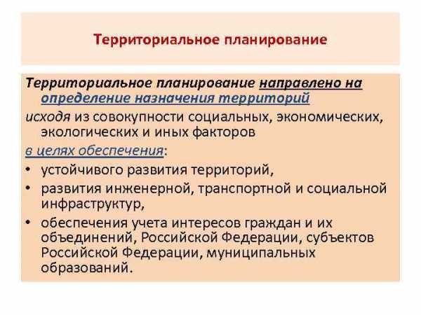 Территориальное планирование направлено на определение назначения территорий исходя из совокупности социальных, экономических, экологических и иных факторов в целях обеспечения: • устойчивого развития территорий, • развития инженерной, транспортной и социальной инфраструктур, • обеспечения учета интересов граждан и их объединений, Российской Федерации, субъектов Российской Федерации, муниципальных образований.