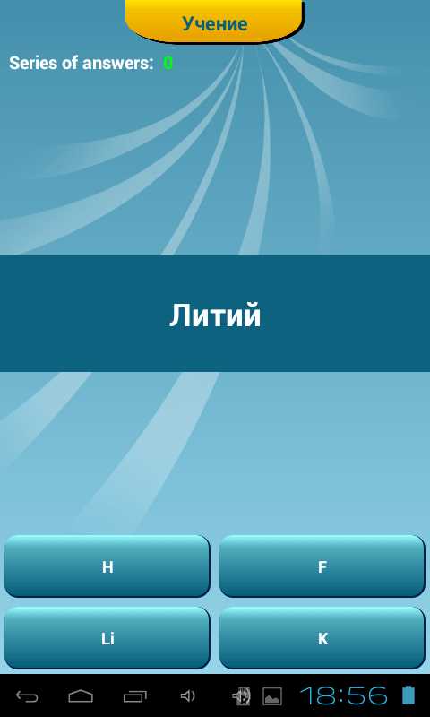 Коснувшись виртуальной кнопки «Учи», вы переходите в следующее меню, позволяющее пройти один из обучающих тестов. Name -> Symbol предлагает пользователю правильно выбрать символ элемента из четырех вариантов. В Symbol -> Name задание противоположное: необходимо правильно указать элемент, символ которого выведен приложением на экран. В этом тесте выбор также осуществляется из четырех предлагаемых вариантов.