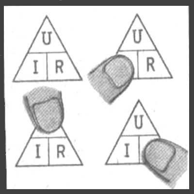 Пользоваться треугольником-подсказкой очень легко и просто. Закрываете своим пальцем, тот параметр цепи, который необходимо найти.