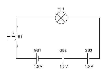 Рассматривая этот закон применительно к фонарику с лампой накаливания и тремя круглыми батарейками начертаем схему: