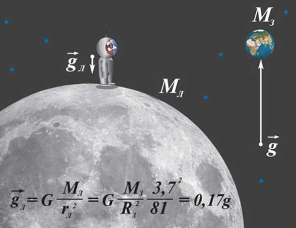 Собственное гравитационное поле Луны определяет ускорение свободного падения gЛ на ее поверхности. Масса Луны в 81 раз меньше массы Земли, а ее радиус приблизительно в 3,7 раза меньше радиуса Земли. Поэтому ускорение gЛ определится выражением: