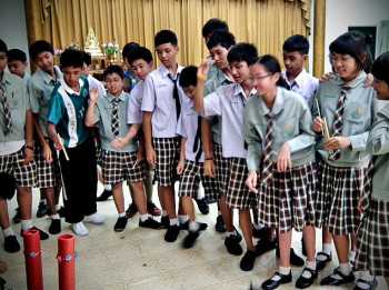 Очень сильно отличается поведение класса от национальности учителя. Здесь вступают в силу тайские традиции. Учитель это лицо уважаемое, старшее по возрасту и дети с тайскими учителями послушны. Тайский учитель говорит на одном языке, кроме того, он может наставлять своих учеников, заставить их слушать. Невозможно представить ситуацию, чтобы на учителя тайца повысили голос! Каждый год в тайских школах проходит церемония “Вай Кру” в которой учителям ученики выражают почтение. Складывается впечатление, что учителя-иностранцы, работают только, чтобы развлечь учеников, своего рода шуты и клоуны.
