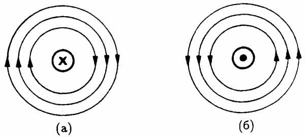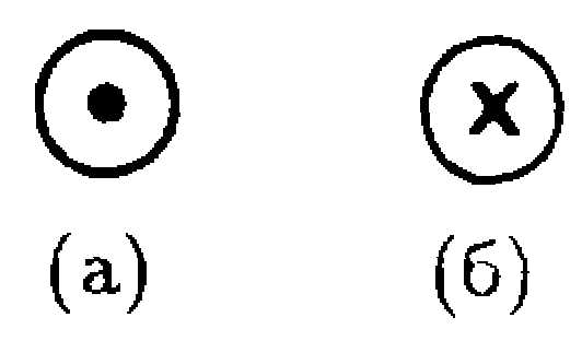 Рис. 7.2. Обозначение направления тока (а) к наблюдателю и (б) от на-блюдателя.