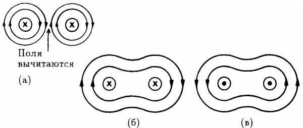 Рис. 7.4. Два проводника с одинаковыми направлениями токов (а) и их результирующее магнитное поле (6, в).