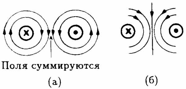 Рис. 7.5. Два проводника с противоположными направлениями токов (а) и их результирующее магнитное поле (б).