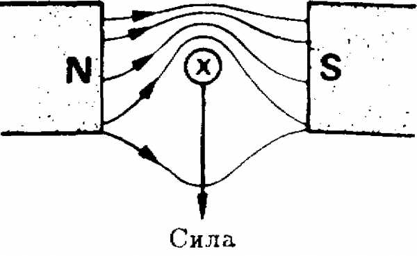 Если проводник с током поместить в магнитное поле, то на него будет действовать сила, которая пытается передвинуть проводник из области более сильного поля в область более слабого, как показано на рис. 7.8. Направление этой силы зависит от направления тока, а также от направления магнитного ноля.