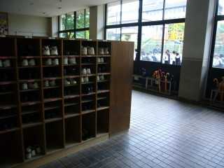 Это вот типично для любой местной школы – стеллажи со сменной обувью. Каждый имеет свою ячейку х(подписанную), где хранится его обувь. Обуви две пары – для хождения внутри школы и спортивная. Большие ячейки внизу – для гостей. На правом снимке видны еще и стойки для зонтов, расписанные по классам и потокам.