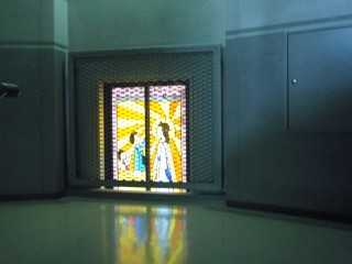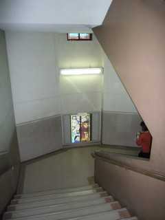 Среднее фото – лестница. В торцах – цветные витражи по детским рисункам на религиозные темы.