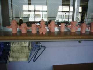 Слева – керамика, типа. Что обозначают эти розовые фигушки, я не знаю. Заметьте – снизу, под полкой – ряд вешалок. Это для пальто и формы, когда переодеваются для занятий физкультурой.