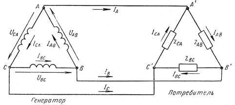На рис. 7 показана схема соединения нагрузок треугольником при трехпроводной системе проводки.