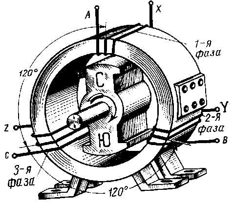 В каждой катушке индуцируется переменная ЭДС одной и той же частоты, но моменты прохождения этих ЭДС через нуль (или через максимум) в каждой из катушек окажутся сдвинутыми на 1/3 периода друг относительно друга, ибо индуктор проходит мимо каждой катушки на 1/3 периода позже, чем мимо предыдущей.