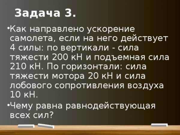 - Как направлено ускорение самолета, если на него действует 4 силы: по вертикали – сила тяжести 200 кН и подъемная сила 210 кН. По горизонтали: сила тяжести мотора 20 кН и сила лобового сопротивления воздуха 10 кН.