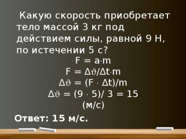 Какую скорость приобретает тело массой 3 кг под действием силы, равной 9 Н, по истечении 5 с?