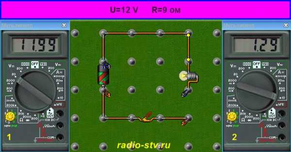 Итак, пока вроде бы все ясно. Теперь давайте попробуем проверить наши знания на практике: пусть есть схема, питающаяся от 12-вольтовой батареи, и электрическая лампа (скажем, большой фонарик). Перед установкой лампочки в фонарик вы измерили сопротивление схемы мультиметром и нашли, что оно равно 9 Ом. Вот формула для расчета электрического тока по закону Ома: