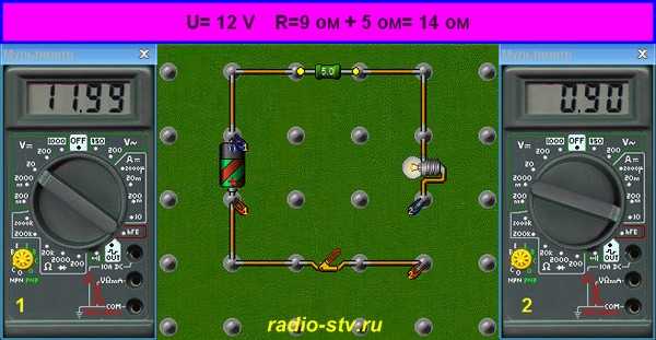 Ну, а что, если вы обнаружили, что лампочка светит чересчур уж ярко? Яркость можно изменить, уменьшив ток, т.е. просто добавив в схему резистор. Изначально мы имели сопротивление схемы 9 Ом; добавив 5-омный резистор в схему, мы повысим ее сопротивление до 14 Ом. В этом случае ток будет равен: