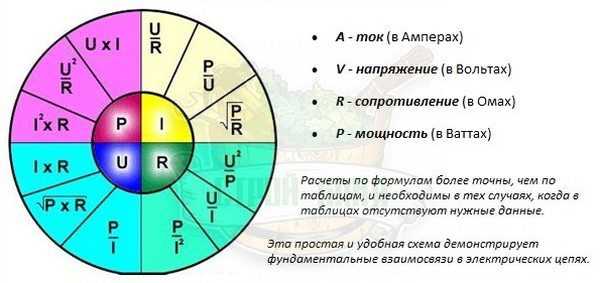 По таблице легко выбрать формулу для расчета требуемого параметра электрической цепи по двум другим известным. Например, нужно определить ток потребления изделием по известной мощности и напряжению питающей сети. По таблице в секторе тока видим, что для расчета подойдет формула I=P/U.