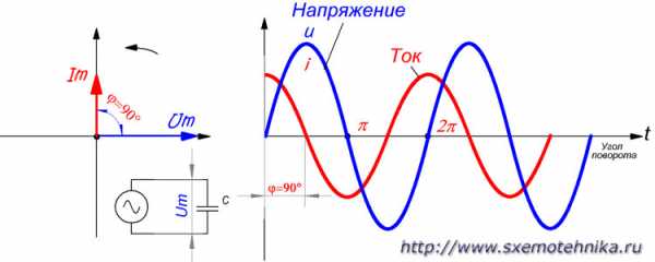 Рисунок 3. Напряжение и ток в цепи с чисто емкостным сопротивлением. Фаза тока опережает фазу напряжения на угол 90 градусов.