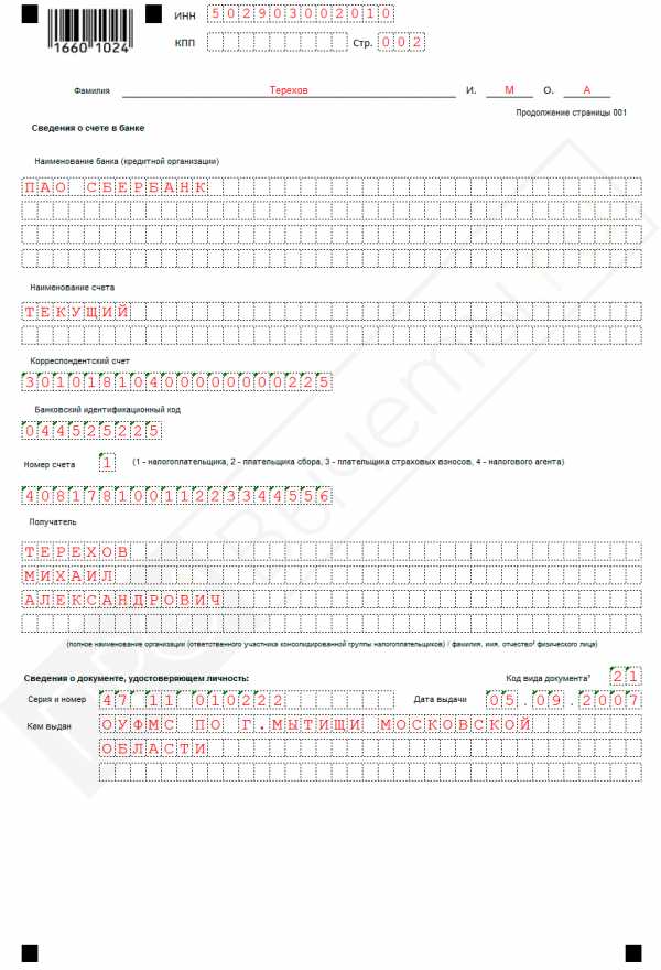 Кроме того, на первой странице документа необходимо наличие подписи подающего лица и даты его составления. На втором листе указываются банковские реквизиты и личные данные получателя.
